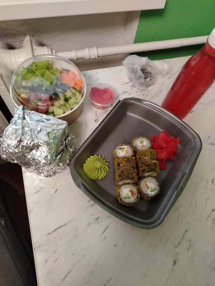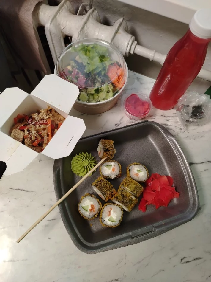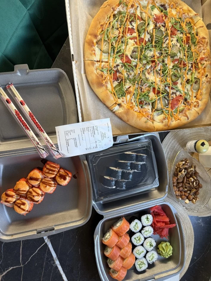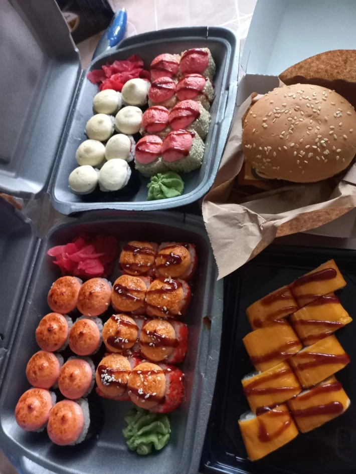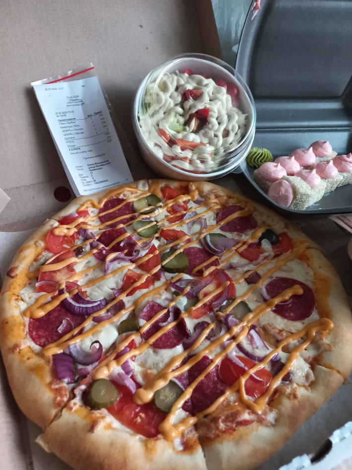 Немного поднадоели стандартные доставки в нашем городе и решили в первые заказать у вас ( хотя были наслышаны о ужасном сервисе и кухне) , но все оказалось наоборот , оказались в максимальном удивление , приехало все достаточно быстро как и сказала оператор, пицца вкусная , но внешний вид страдает, роллы и салаты просто бомба , бургеры стандартные!